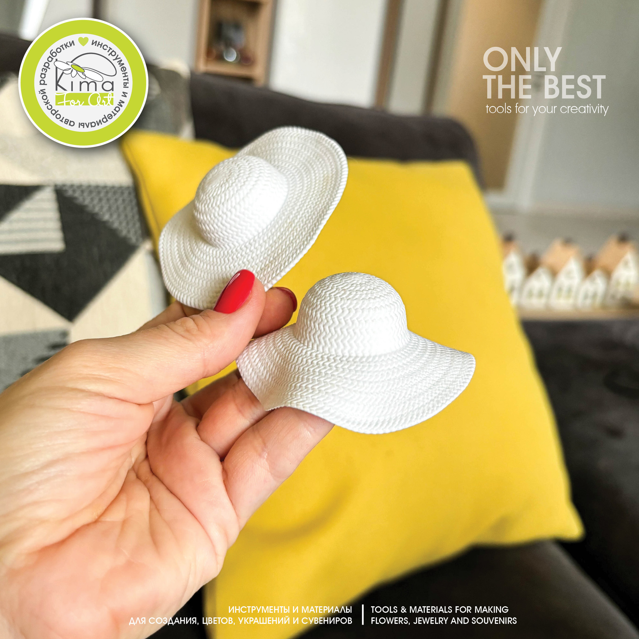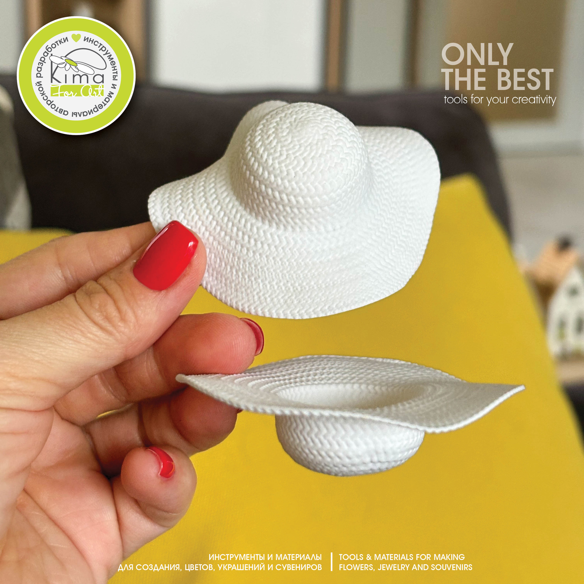 1. Положите пласт глины на выпуклую часть, обомните вокруг молда спонжем, обрежьте каттером прямо в молде. 2. Отпечатайте фактуру. 3. Вы можете придать шляпке нужую форму перед сушкой/запеканием. Для украшения подойдёт наша цветочная миниатюра MICRO. Вы можете создать шляпку для куклы или приклеить магнит и сделать её брошью с цветами.